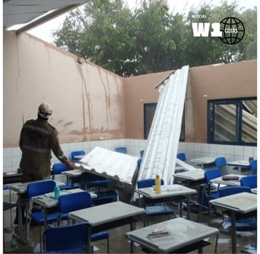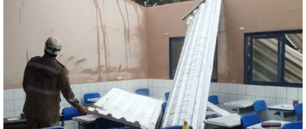 Chuva arranca telhas de salas de escola em Senador Canedo e deixa alunos feridos.